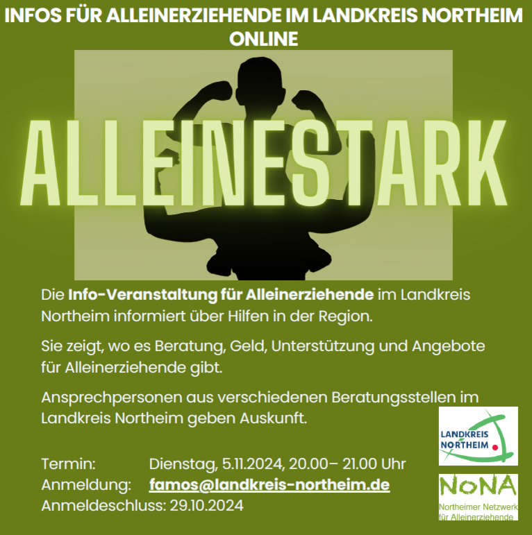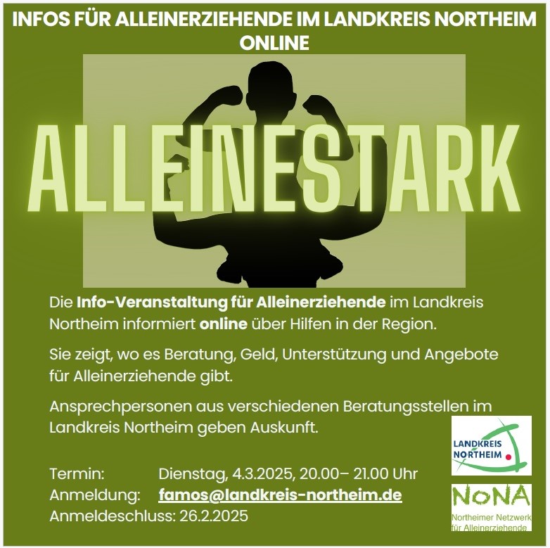 Heute weisen wir Sie auf die neue Online-Infoveranstaltung „AlleineStark“ hin, das von dem Northeimer Netzwerk für Alleinerziehende (NoNA) angeboten wird.