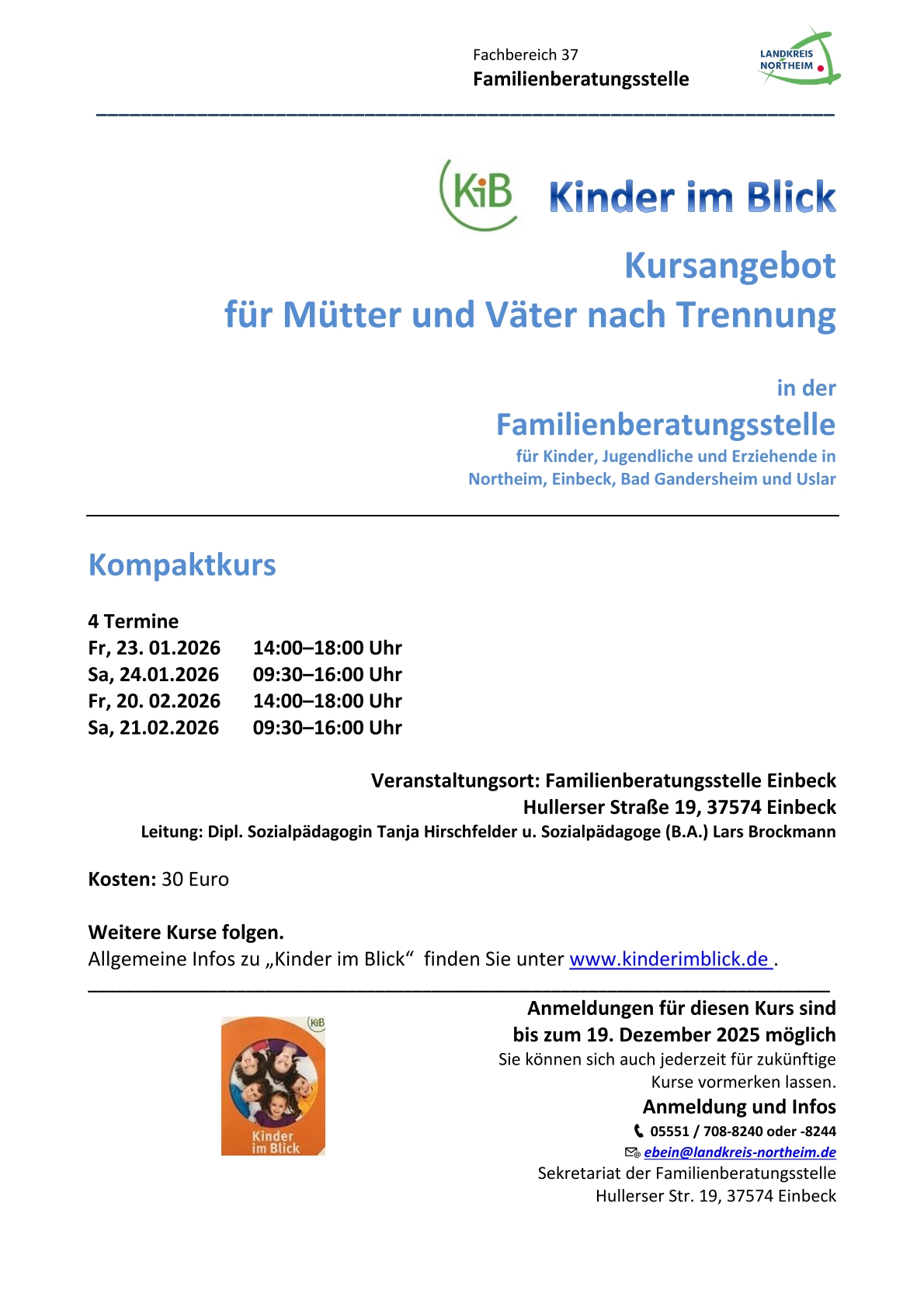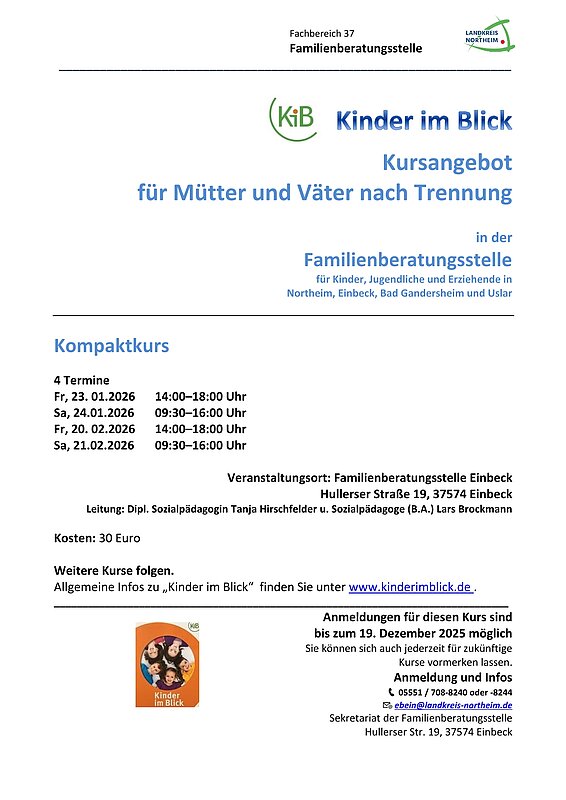 Das Angebot richtet sich an getrenntlebende Mütter und Väter im Landkreis Northeim. Im Laufe des Jahres 2025 sind weitere KiB-Kurse geplant, sowohl online als auch in Präsenz. Eine Vormerkung für nachfolgende Kurse ist möglich.