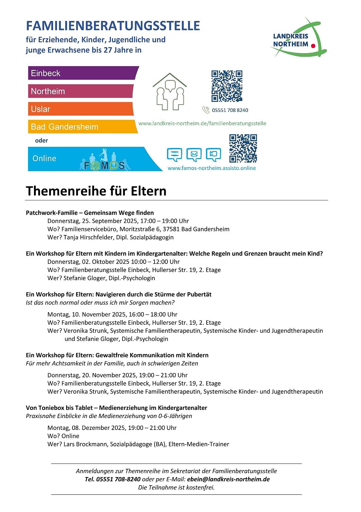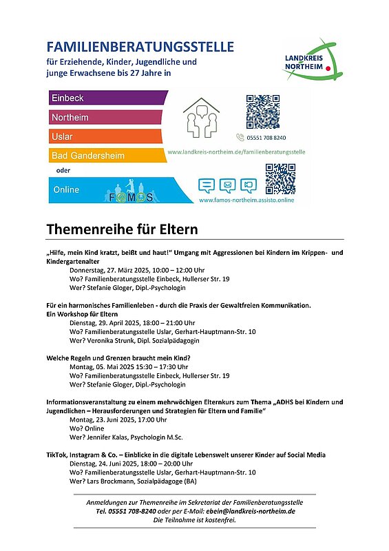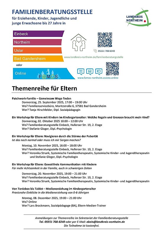 Hier informieren wir Sie über aktuelle Veranstaltungen von FAMOS, den Familienberatungsstellen vor Ort und anderen Anlaufstellen im Landkreis Northeim.