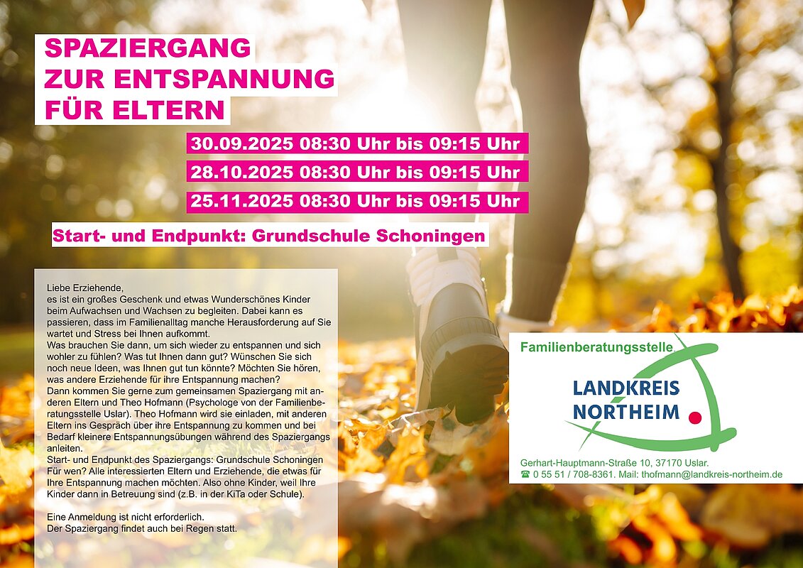 Anmeldung: Bitte melden Sie sich bis zum 20. Januar 2025 per E-Mail an: ebein(at)landkreis-northeim.de. Bei Fragen hilft Ihnen das Team der Familienberatungsstelle gern weiter.