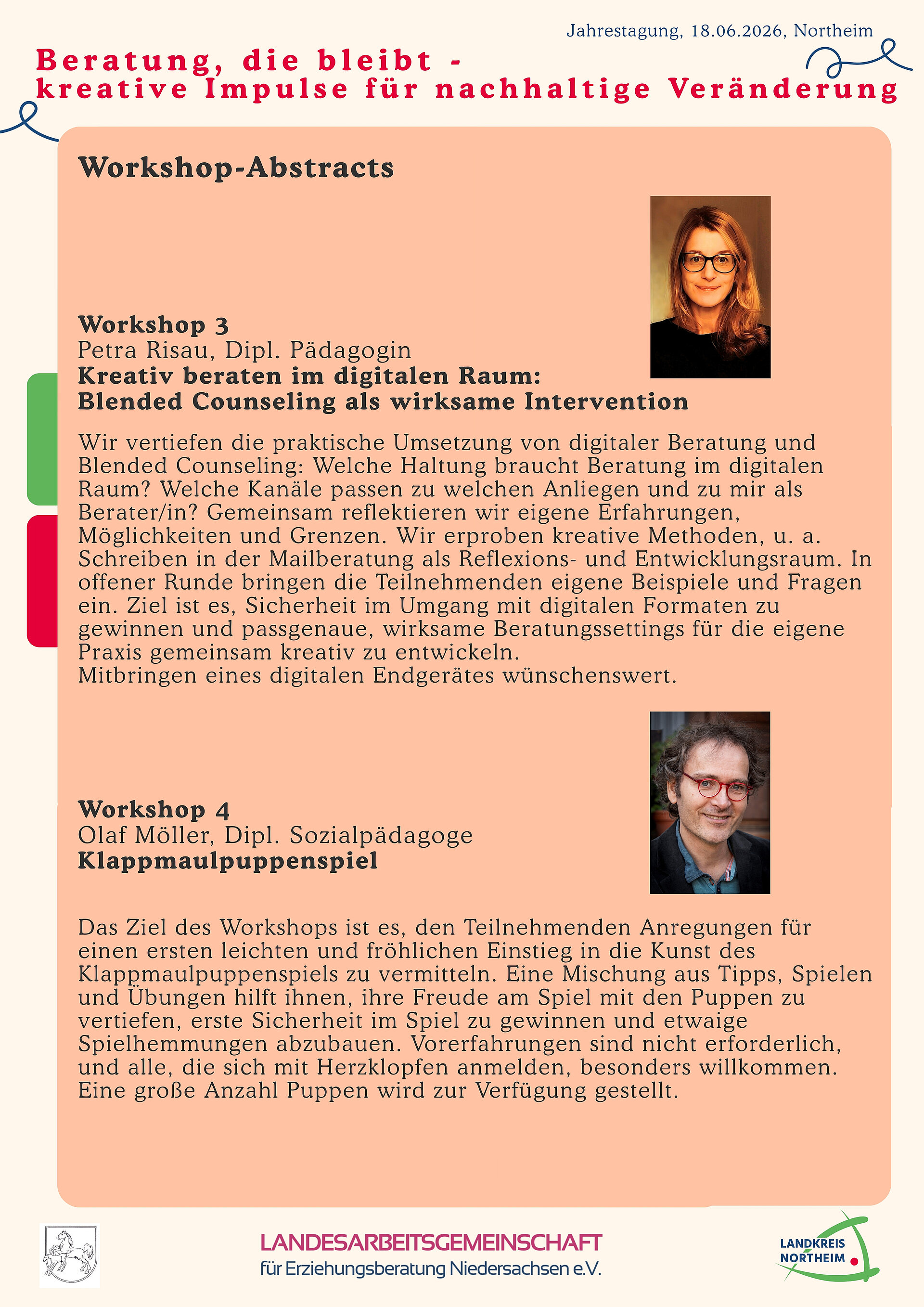 Bitte wählen Sie zunächst einen Workshop aus, an dem Sie teilnehmen möchten. Über den jeweiligen Workshop-Link gelangen Sie anschließend zum Anmeldeformular, über das Sie sich für die gesamte Jahrestagung registrieren können.